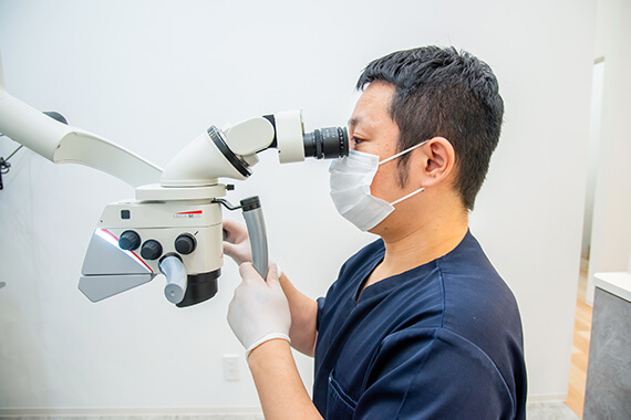 マイクロスコープを使用することで、複雑に入り組んだ根管の内部を観察することが可能です。それにより、病巣を詳細に確認することができるため、肉眼では見えない病巣の取り残しを防ぐことが可能です。また、健康な部位を傷つけることなく治療可能なため、負担をできるだけ抑えることができます。