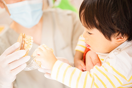 当院ではお子さまの年齢や理解度を確認しながら、わかりやすい言葉でブラッシング指導を行い、正しいお口の健康習慣を身につけられるように支援しております。お子さまが小さなうちから予防意識を高め、成長してからも歯やお口の健康意識が継続するよう、サポートいたします。
