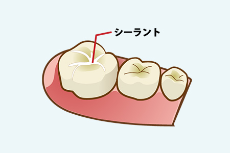 シーラントは、奥歯の複雑な形状部分に歯科用樹脂を埋め込み、むし歯の発生を抑制する処置のことです。埋め込む歯科用樹脂にはフッ素が含まれているため、むし歯予防だけでなく、歯質を強くする効果も期待できます。こうした処置を行い、お子さまが歯やお口のトラブルなく成長できるよう支援いたします。