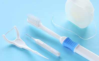 むし歯や歯周病予防のためには、歯と歯の隙間の汚れも取り除く必要があります。デンタルフロスや歯間ブラシなどの補助清掃用具の使用がおすすめです。